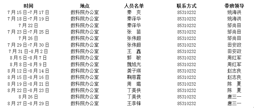 上班时间:上午08:00-12:00;下午14:30-17:30 办公电话:85310232;公司总值班电话:85310005;报警电话:85310110;急救电话:85310120—8120 注意事项:1、按时上下班;2、保持办公场所干净整洁;3、注意安全和防火,每天定时巡查公司办公场所;4、做好假期信件的收发工作,每周一、周四取信件;5、每周五给花浇水一次;6、值班结束时须做好办公室钥匙的交接工作;7、遇紧急突发情况,及时向相关领导汇报。