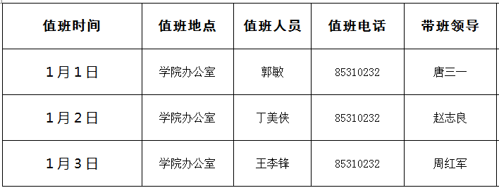 上班时间:上午08:30-12:00;下午14:30-17:30 办公电话:85310232;公司总值班电话:85310005;报警电话:85310110;急救电话:85310120—8120 注意事项:1、按时上下班;2、保持办公场所干净整洁;3、注意安全和防火,每天定时巡查公司办公场所;4、做好假期信件的收发工作,每周一、周四取信件;5、每周五给花浇水一次;6、值班结束时须做好办公室钥匙的交接工作;7、遇紧急突发情况,及时向相关领导汇报。