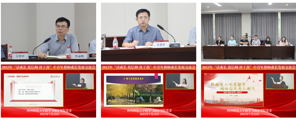 为聚焦中青年教师发展问题,助力中青年教师在教学、科研、育人等方面实现快速成长发展。2022年7月13日,数学与统计公司党委在文津楼1224公司报告厅举办以“话成长 筑信仰 鼓干劲”为主题的中青年教师成长发展交流会。公司曹怀信教授,吴建华教授,经理李永明,党委书记辛省平,副经理周红军、陈夏、袁冰,党委组织员、团委书记王鑫,以及公司中青年教师通过线下线上方式参加。活动由研究生辅导员秦泽华主持。