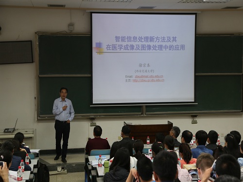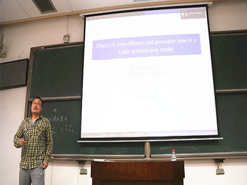 论坛由西安交大云顶国际8588yd易媛教授主持。西安交大研究生院常务副经理吴宏春教授、云顶国际8588yd经理彭济根教授分别为此次论坛致辞。简短的开幕式后,大家的掌声迎来了本次论坛的特邀嘉宾徐宗本院士的报告《智能信息处理新方法及其在医学成像及图像处理中的应用》。徐院士语言幽默风趣,讲解深入浅出、通俗易懂,公司参加报告的老师和同学受益匪浅。本次论坛共进行了8场学术报告,公司博士研究生李善兵就自己的研究成果作了报告,报告题目为《Effects of cross-diffusion and protection zone in a Leslie predator-prey model》,这些报告开拓了同学们的研究视野,增进了数学学科不同方向间的交流。在师生交流与提问环节中,师生们各抒己见,思想交锋。公司同学认真聆听并积极提问,与报告嘉宾热烈讨论。