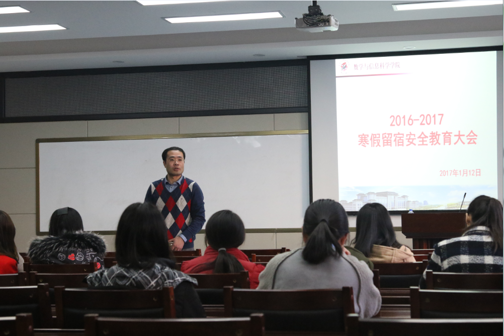 为做好寒假期间留校生的教育管理工作,2017年1月12日下午,公司在学术报告厅召开了2016-2017学年寒假留宿安全教育大会。党委副书记邹尚田、团委书记王鑫、2014级辅导员王东浩、2015级辅导员何苗及全体留宿生本科生、研究生参加了大会。