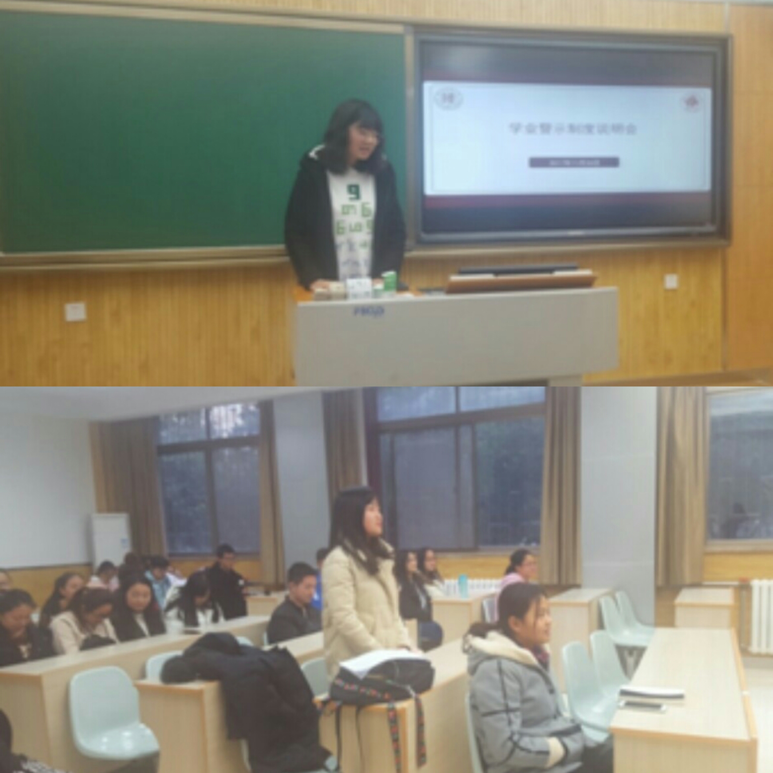 免师二班班长吴翔宇通过和同学们分享三个关键词“尊重,选择,适应”――希望同学们能适应新的环境和新的学习方式,并让大家将学业警示当成动力。免师三班班长撖硕果为大家重点强调了“2”与“6”,即2门次6学分,希望目光长远严要求,力争80分。班内胡雪妮和谭伟同学随后与大家分享了他们的学习经验。